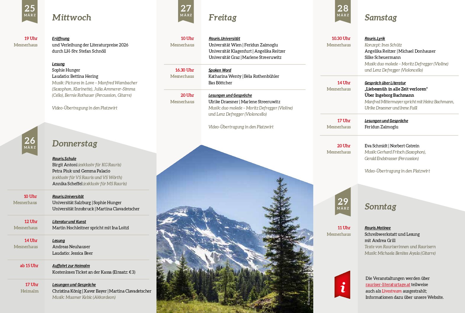 Diese Seite bietet Informationen über das Programm der 55. Rauriser Literaturtage 2026 – im Überblick und mit detaillierten Angaben zu jeder einzelnen Veranstaltung.